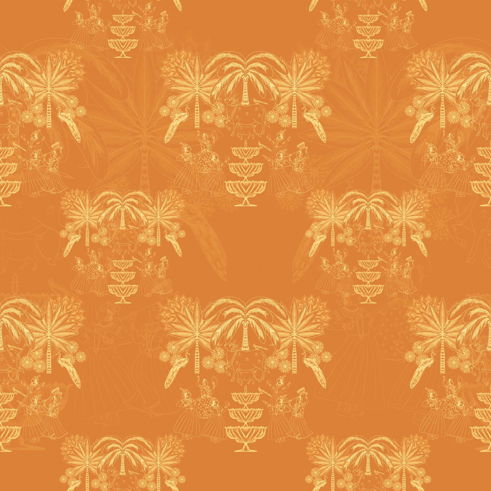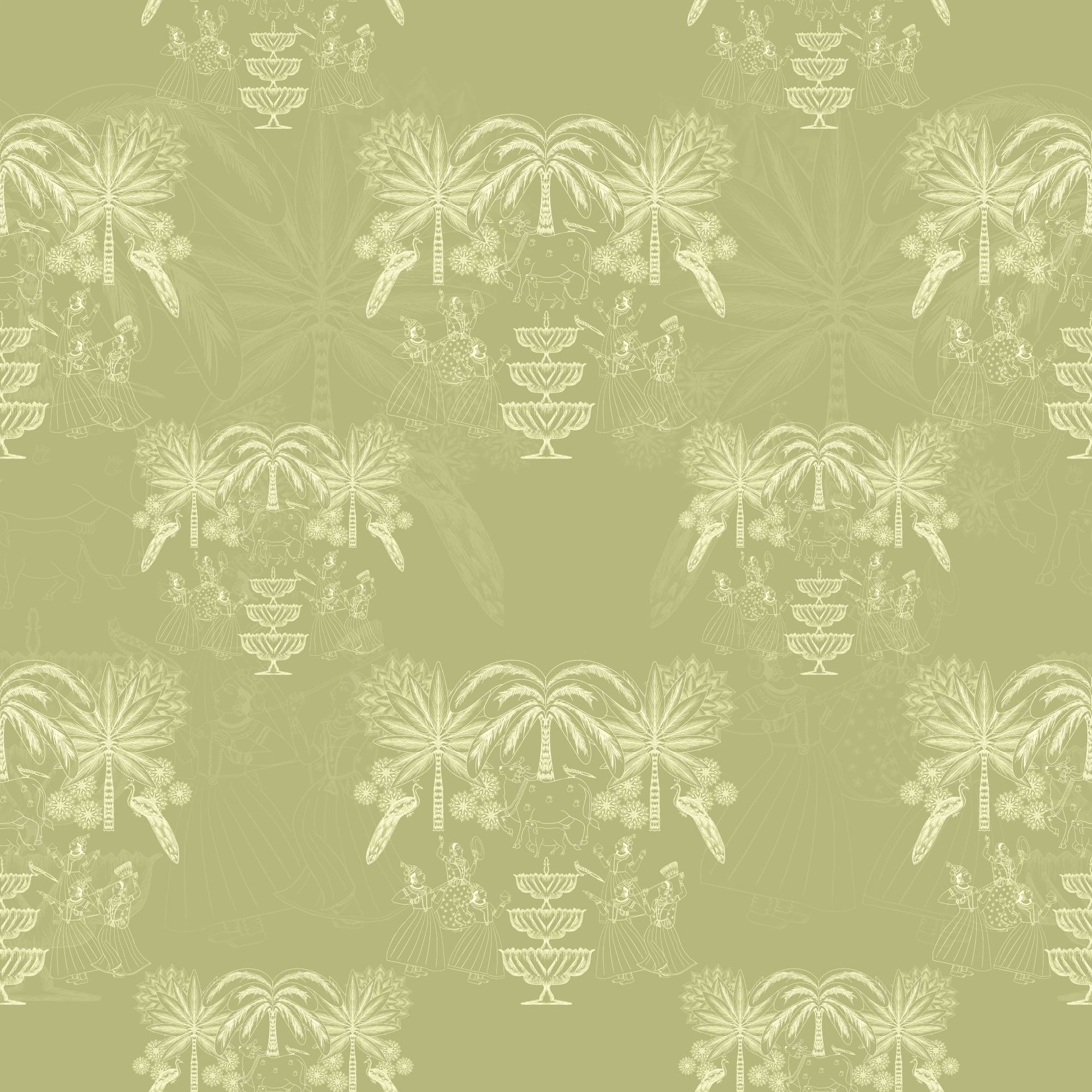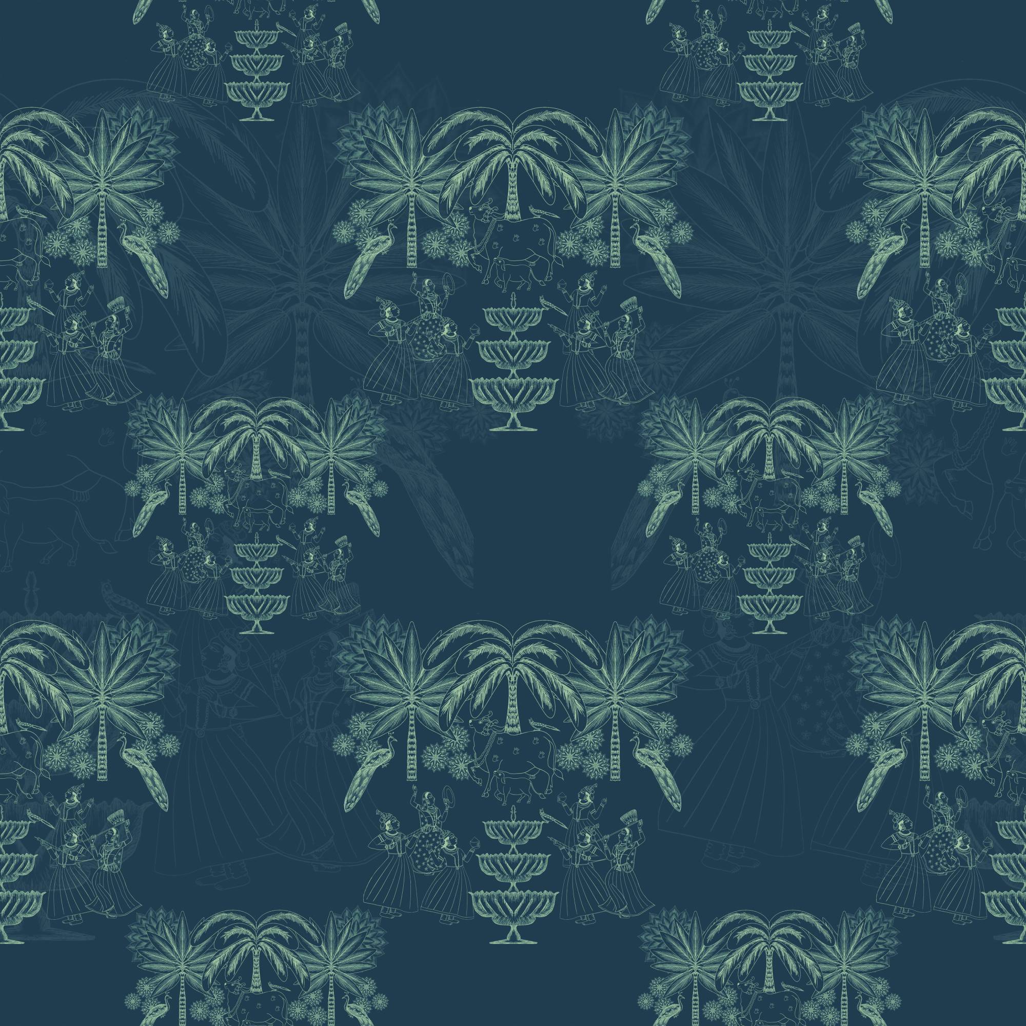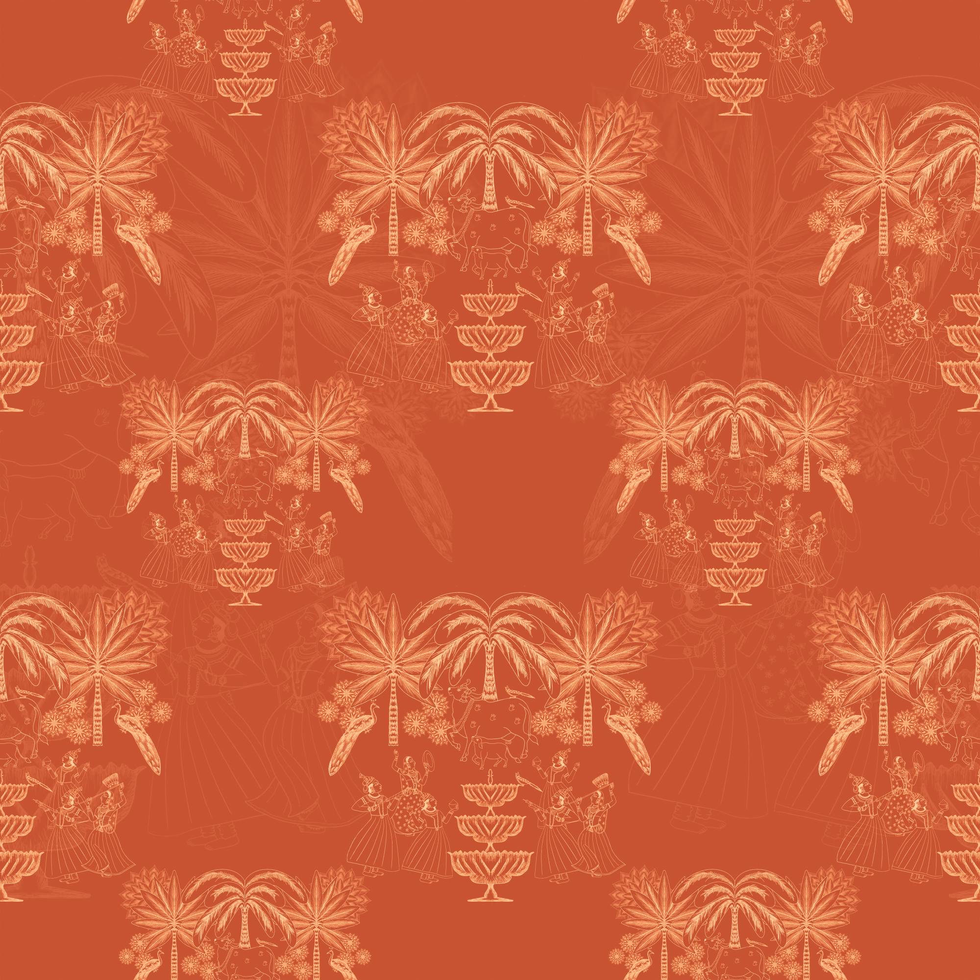 The entire collection draws inspiration from the rich heritage of Rajasthani folk art, particularly the intricate and vibrant tradition of Pichwai painting. Each piece has been meticulously crafted using the elegant French technique of Toile de Jouy, blending cultural motifs with a touch of European sophistication. Every element in the collection has been lovingly hand-drawn on a digital platform, reflecting a deep appreciation for detail and artistry.